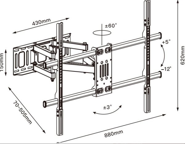 Minimální velikost obrazovky: 55'' Maximální velikost obrazovky: 100'' VESA max: 800 x 600 Maximální hmotnost televize: 65 kg Vertikální nastavení: 12 ° Horizontální nastavení 3° Vzdálenost od zdi: 70 - 505 mm Rozace: 60°