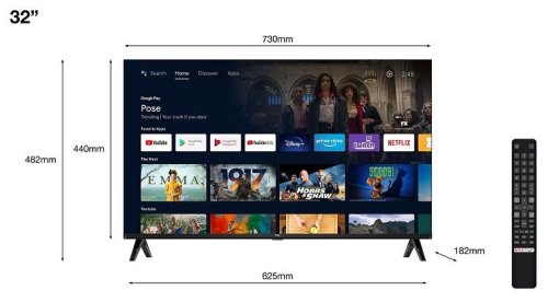 Televize SMART ANDROID LED, 81cm, Full HD, 50Hz, Direct LED, HDR10, DVB-T2/S2/C, H.265/HEVC, 2× HDMI, 1× USB, CI+, LAN, WiFi, Bluetooth, DLNA, Chromecast, hlasové ovládání, Google Assistent, párování s mobilním zařízením, VESA 100×100, Dolby Audio, en. třída F