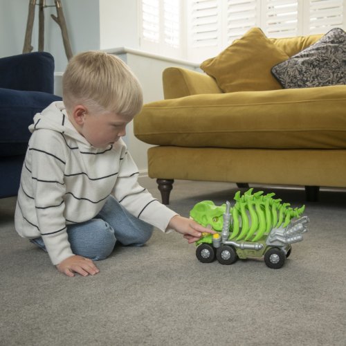 Zvuky řvoucího dinosaura Blikající žluté oko Otevírací čelisti při pohybu Prostor na uložení autíček Součástí balení jsou 3× AAA baterie