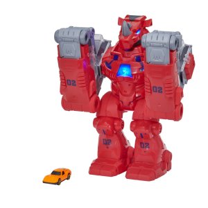 Teamsterz Robo Wreckerz Rhino Slam představuje unikátní hračku, která kombinuje prvky robota a zvířecího monstra v jednom produktu. Tento červený robot ve tvaru nosorožce je vyroben z pevného plastu a jeho výrazným rysem jsou modře svítící LED oči a světelný efekt na hrudi, které umocňují dojem akce a připravenosti k útoku. Ramena robota jsou robustní, s šedými detaily a průhlednými panely, které slouží jako závodní dráha pro malá autíčka, jež jsou součástí balení.