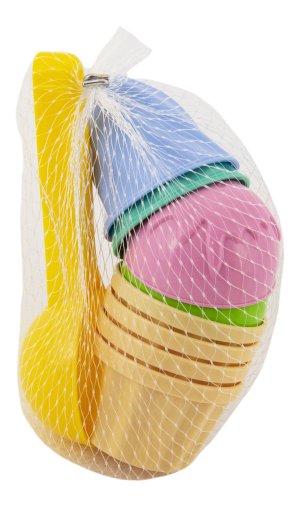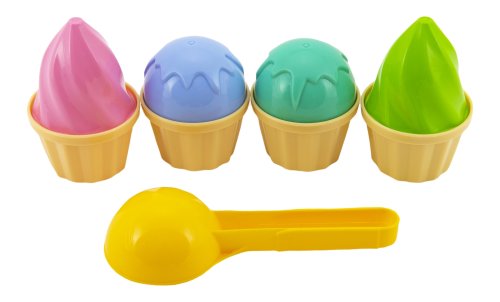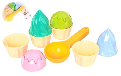 Báječná sada formiček na písek, se kterou mohou děti tvořit lákavé zmrzlinové kornouty a různě je zdobit. Balení obsahuje: naběračku na zmrzlinu, 4x kornoutek a 4x kopeček zmrzliny. Upozornění: Barevné provedení výrobku se může od vyobrazení mírně lišit.
