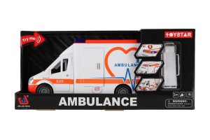 Ambulance je vozidlo, které se využívá při přepravě zraněných pacientů, k dopravě raněných nebo nemocných. Navíc ambulance disponuje lehátkem pro převoz pacientů. Baterie 2x AA jsou součástí výrobku. Ambulance má otevírací dveře a je na setrvačník. Vyrobeno z kvalitního a odolného plastu. Velikost auta je 28 cm. Rozměry balení 39 x 18 x 12 cm Vhodné pro děti od 3 let.