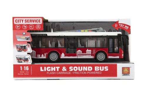 Autobus městské hromadné dopravy pro všechny malé šoféry a řidiče. Model autobusu v měřítku 1:16 je vyroben z kvalitního plastu, na setrvačník, se světlem a se zvukem. Baterie 3x AG13 jsou součástí balení. Rozměry balení 32 x 11 x 17 cm. Vhodné pro děti od 3 let.