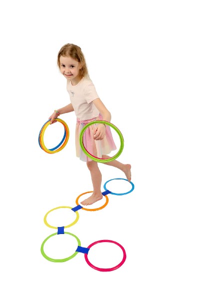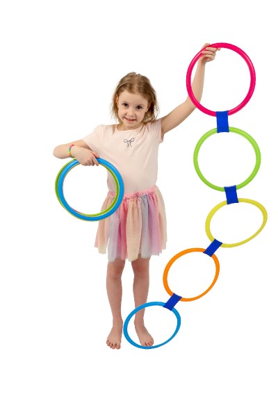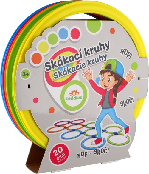Pestrobarevné kroužky jsou oblíbenou pomůckou pro cvičení dětí, dospělých ať už ve školách, jiných vzdělávacích zařízeních nebo jen tak ve volném čase. Je možné s nimi žonglovat rukama i nohama nebo třeba házet na cíl. Při nácviku udržení rovnováhy lze kroužky nosit i na hlavě po jednom nebo i více kusech. Nebo si raději z kroužků vytvoříte skákacího panáka? Je to jen na Vás! Tyto kruhy podporují rozvoj osobnosti a fantazie dětí i dospělých. Dejte tyto kroužky dětem a uvidíte, jak budou ve vymýšlení her kreativní! V balení je 10 ks kroužků v pěti barvách a 10 ks spojek, kterými kruhy můžete spojit do libovolného tvaru. Průměr kroužku: 27 cm Vhodné pro děti od 3 let