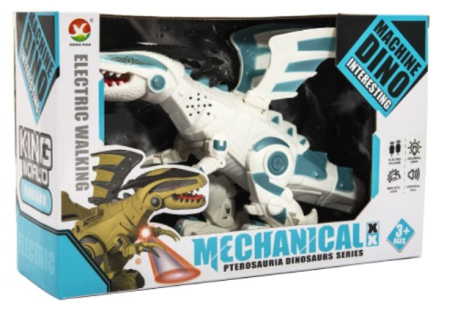 Zajímavá hračka pro děti, které mají představivost na vytváření příběhů. Chodící dinosaurus vydává zvuky, svítí, má odnímatelná křídla, hýbe ocasem do stran. Ocas lze také odejmout. Pro provoz jsou třeba baterie 2x AA (nejsou součástí balení). Délka dinosaura: 35 cm POZNÁMKA: Balení obsahuje 1ks dinosaura. Obrázek je pouze ilustrativní. Balení dodáváme dle skladové zásoby.