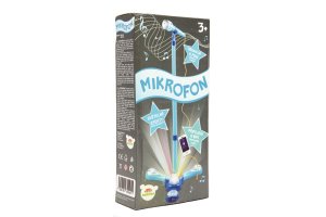 Modrý mikrofon musí být součástí každé karaoke party. S okouzlujícími barevnými světelnými efekty si budete připadat jako hvězda na koncertě. Mikrofon obsahuje 12 písní. Připojte MP3 nebo mobilní telefon a pouštějte do mikrofonu vlastní hudbu. Sestavení: 1.) sestavení tripodu (podstavce): zasuňte stabilizační tyčky do podstavce 2.) nasaďte stetoskopickou tyč (tyč, která drží mikrofon) na podstavec 3.) nastave výšku, kterou potřebujete 4.) připevněte mikrofon Nastavitelná výška mikrofonu je 40 - 80 cm. Kabel pro připojení MP3/mobilního telefonu je součástí balení. Mikrofon je na 3 baterie typu AA. Baterie nejsou součástí balení. Rozměry balení 17 x 34 x 7 cm. Vhodné pro děti od 3 let.