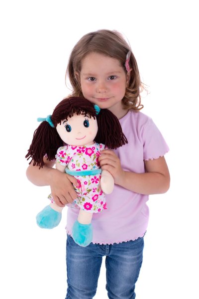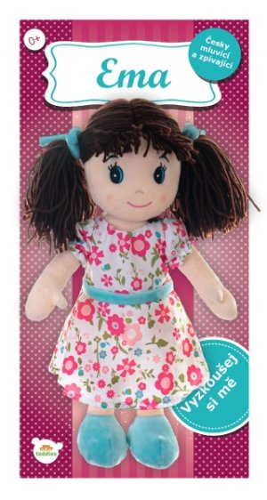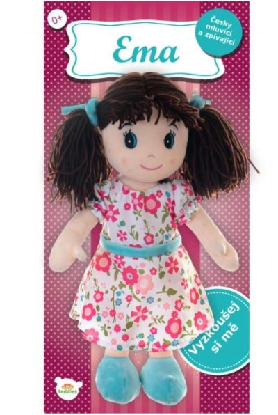 Krásná látková panenka, která umí dvě písničky a dvě básničky. Po zmáčknutí bříška povídá: "Ahoj, já jsem Ema, budeme si spolu hrát?" zpívá písničky "Pásla ovečky..., Šel zahradník do zahrady..." a umí i dvě básničky "Učila mě babička, dvě kouzelná slovíčka.....Každé ráno na kopeček, běží malý mraveneček...." Výrobek obsahuje nevyměnitelné baterie. Velikost panenky 40 cm. Rozměry balení 21 x 42 x 8 cm. Vhodné pro děti od 0 let.