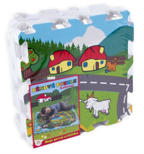 Zábavné hraní na vesnici! Pěnové podlahové puzzle bez vyjímatelných částí s barevnými zvířátky, domečky a silnicemi je ideální pro rozvoj dětské fantazie. Doplňte hrací plochu o libovolná autíčka, stromy, figurky lidí a zvířátek či stavby z kostek a sdílejte s dětmi jejich příběhy. Pěnový koberec je omyvatelný, zdravotně nezávadný, tlumí hluk a skvěle izoluje. Tloušťka 1,2 cm. Pro děti od 3 let. Otírejte vlhkým hadříkem.