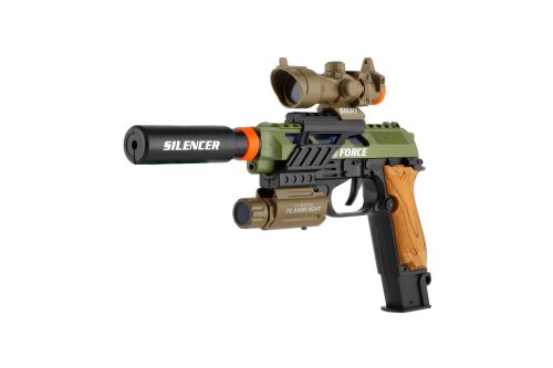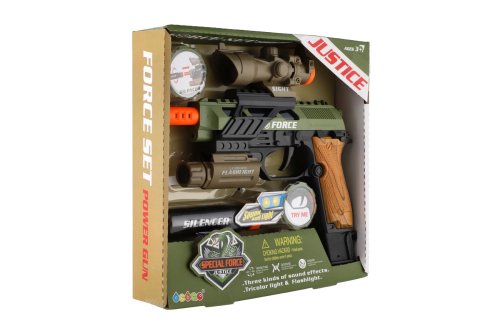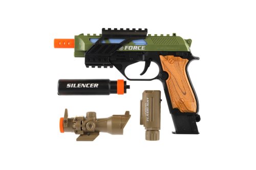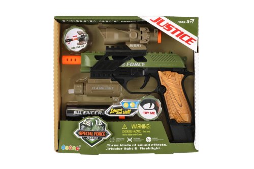 Pistole je reálně vypadající zbraň z plastu se zajisté bude líbit všem klukům, kteří mají rádi zbraně. Pistol vydává zvuky a svítí a v sadě najdete i zaměřovač, světlo a tlumič. Na baterie - pistol 3x 1,5V AA, světlo 3x AG13, které jsou součástí. Rozměr krabice: 25 x 23 x 5 cm Vhodné od 3 let