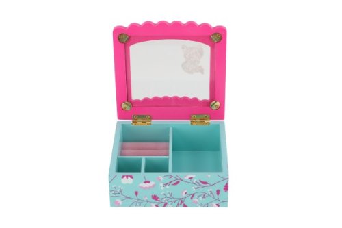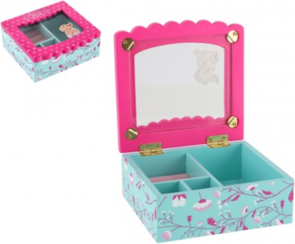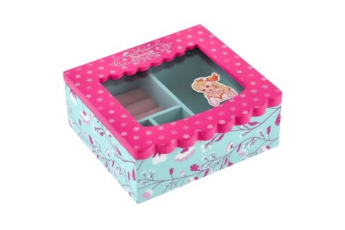 Šperkovnice bude ideálním místem pro uložení pokladů každé dívky. Je vyrobena ze dřeva a má skleněné víko. Šperkovnice má modrou barvu a je pomalována krásným motivem kytiček. Víko je růžové, má na sobě kytičky a samolepku princezny. Tato barevná kombinace bude ideální doplněk pro dětský pokoj. Uvnitř je prostor pro pořádání suvenýrů nebo šperků. Rozměr šperkovnice: 12,5x12x5cm Není hračka
