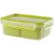 Obdelníková dóza s objemem 1,0 l Systém uzavírání se 4 klipy po stranách Součástí 2 misky co se vejdou dovnitř Bezpečné pro použití v mikrovlnné troubě, mrazničce a myčce V zelené barvě