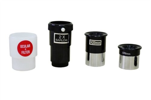 Vestavěný zásobník na příslušenství udržuje po ruce okuláry. Teleskop je vybaven jedním 6mm a jedním 20mm okulárem a 2 Barlowovými čočkami, které znásobují ohniskovou vzdálenost dalekohledu. Rozsah zvětšení je v základní konfiguraci od 25x až do 167x. Hledáček s červenou tečkou vám ulehčí teleskop nasměrovat na libovolný astronomický objekt.