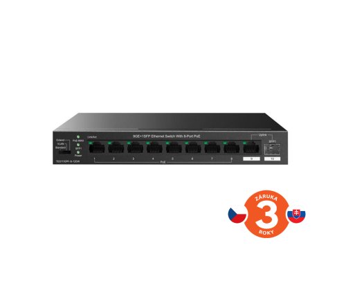 Technické parametry Standarty&protokoly: IEEE802.3, IEEE802.3u, IEEE802.3ab, IEEE802.3x, IEEE802.3af, IEEE802.3at Porty: 8x 10/100/1000 Mbps porty-02.at.at RJ345af auto PoE standart Porty pro Uplink: 1x RJ45 10/100/1000 Mb/s, 1x SFP 100/1000 Mb/s Celková propustnost: 20 Gbps Velikost tabulky MAC adresa: 8K Režim přepínání: Store-And-Forward Ventilátory: ne, bezventilátorový port 1x Napájení Napájecí adaptér, 1x Napájecí zdroj 1x Indikace/E napájení: Port 1 až Port 8 podporují standard IEEE802.3at/af napájení (maximální výkon pro každý port je 30W), celkem 110 Watt pro PoE Úroveň přepěťové ochrany: - pro porty: 6kV, - pro napájení: 6kV, ESD: vzduch: ±10kV, kontakt: ±8000000000000 Rychlost přeposílání paketů: 14,9 Mpps Napájení: vstup 100 až 240 V, AC 50/60 Hz pro napájecí adaptér Spotřeba: 10 W (bez napájení PoE), 120 W (s připojenými PoE zařízeními max. 110 W) Rozměry: 177,5 mm x 104 mm W x 26 mm napájení PoE: 110W Ochrana proti přepětí: 6 000 V Umístění: na stěnu, desktop Pracovní teplota: 0oC ~ 45oC Vlhkost: 10%-90%RH (nekondenzující) Certifikace: CE/RoHS