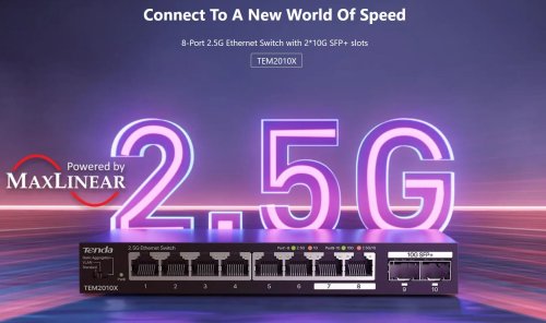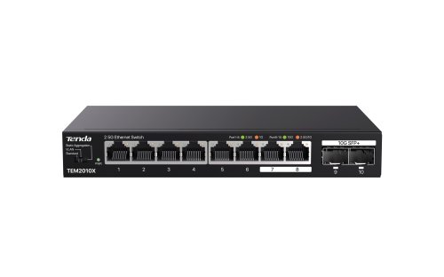 Tenda TEM2010X je 8mi portový 2.5G Ethernet switch a 2x 10G SFP+ porty. 8x RJ45 port 100/1000/2500 Mb/s + 2x SFP+ port 1000/2500/10 000 Mb/s. Propustnost 80 Gb/s, ochrana proti přepětí 6 kV, tabulka pro MAC adresy 16K. Přepínání VLAN, Agregation, Standart. Kovový obal.