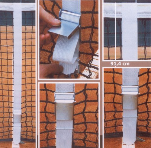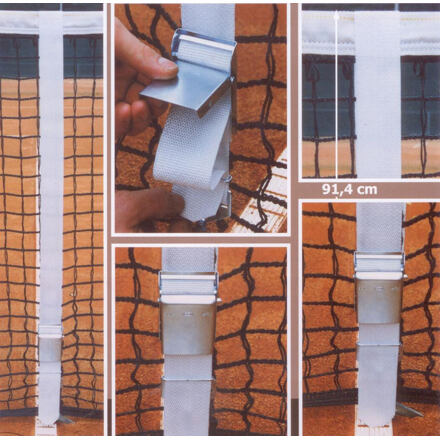 Středová páska Tenis Exacta Vám pomůže jednoduše a rychle nastavit správnou výšku tenisové sítě. Instrukce: Pro správnou výšku sítě 91.4 cm nastavte popruh tak, aby značící bod ležel na kraji sítě a konec popruhu, aby se dotýkal země. Pás provlékněte skrz přezku.