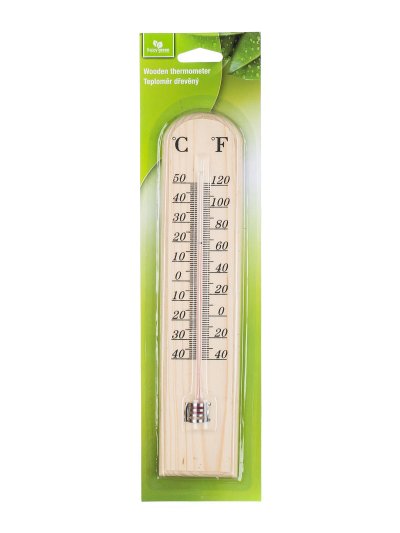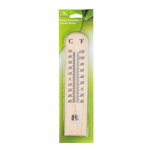 Dřevěný teploměr 25,5 x 5,5 cm má dvě stupnice v rozpětí - 40 až + 50 st. Celsia / - 40 až + 120 st. Fahrenheita. Je opatřen háčkem na zavěšení. Rozměry: 25,5 x 5,5 cm.