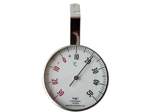 Okenní kulatý teploměr, s přehlednou stupnicí, pro vnější použití. Je vhodný pro připevnění na rám okna.