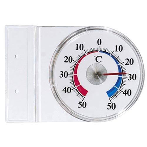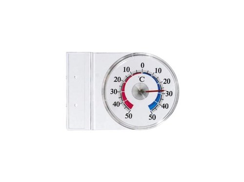 Okenní kulatý teploměr s přehlednou stupnicí pro vnější použití vhodný pro připevnění na rám okna.