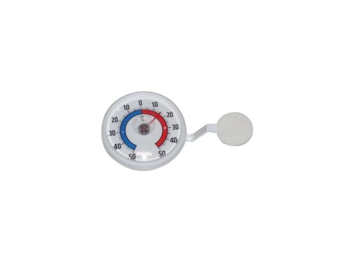 Okenní kulatý teploměr s přehlednou stupnicí pro vnější použití vhodný pro připevnění na rám okna.