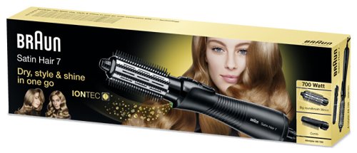 Nový teplovzdušný ondulační kartáč Braun Satin Hair 7 upraví vaše vlasy šetrně a efektivně, takže budou každý den krásné a lesklé, ať už máte jakýkoli střih či délku vlasů. Inovační technologie IONTECStejně jako všechny přístroje řady Braun Satin Hair 7 obsahuje také teplovzdušný ondulační kartáč Braun Satin Hair 7 průlomovou inovační technologií IONTEC. IONTEC je jedinečná technologie určená speciálně k ochraně zdraví vašich vlasů. Proto je také zárukou zdravé úpravy vlasů. Zelené iontové trysky uvolní do vlasů při jejich úpravě efektivně miliony saténových iontů, které přitáhnou částečky vlhkosti ze vzduchu. Výsledkem je bezvadný, zářivě lesklý účes, který odráží zdraví vašich vlasů. Vyvážený obsah vlhkostiSaténové ionty obklopí každý jednotlivý vlas a rychle obnoví rovnováhu jeho vlhkosti, která se obvykle při úpravě vlasů teplem ztrácí. Antistatická úprava vlasůDíky jedinečné iontové technologii vznikne bohatý proud saténových iontů, které obklopí každý jednotlivý vlas. Toto pokrokové působení iontů funguje při úpravě vlasů jako přirozený zvlhčovací prostředek, který omezí polétavost vlasů a jejich statický náboj. Vaše vlasy budou nádherně zářivé a hladké. Ochrana před lámáním vlasůSpeciálně navržené nástavce s kartáčem a hřebenem chrání díky své unikátní technologii hladkých hrotů vlasové kutikuly před poškozením a lámáním. Filtr s mřížkouGeniální filtr s mřížkou v zadní části ergonomicky tvarované rukojeti pomáhá předcházet lámání vlasů. Zabraňuje tomu, aby byly vlasy vtaženy do přístroje, kde by se mohly zamotat. Díky tomu je úprava vlasů ještě bezpečnější. Osobní nastaveníIndividuální úprava vlasů si žádá možnost individuálního nastavení. Dva stupně nastavení umožňují přizpůsobit teplotu a intenzitu proudění vzduchu dle vašich potřeb. Můžete si být jistá, že teplota a intenzita proudění vzduchu vždy přesně odpovídá typu vašich vlasů, takže ty se pak při úpravě nepřesuší.