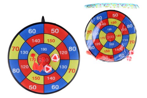 Terč na suchý zip o velikosti cca 35,5 cm se dvěma míčky a dvěma šipkami. Rozměry balení cca 37 x 39 cm. Věk 3+