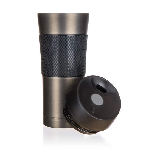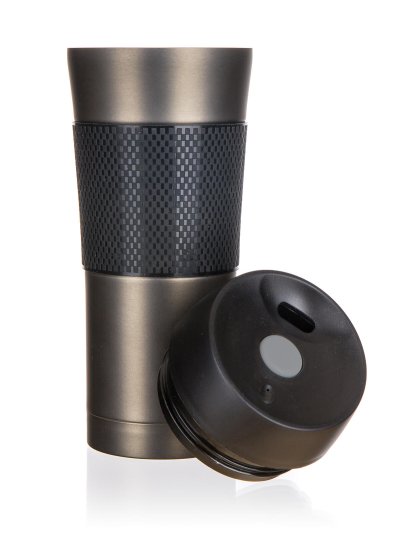 Cestovní hrnek AKCENT dvoustěnný, je vhodný na teplé i studené nápoje. Vnější část z nerezu 201 v kombinaci s černým silikonovým rukávem a vnitřní část z nerezu 304. Využitelný objem je 420 ml.