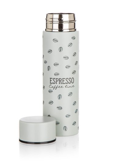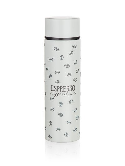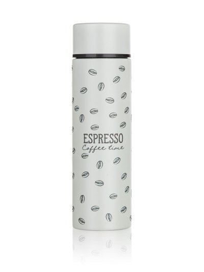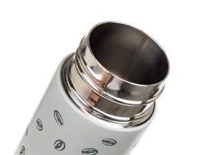 Nerezová cestovní termoska MINI v šedé barvě s dekorem kávových zrn, má dvouplášťové provedení, díky kterému udrží nápoj déle svou teplotu.