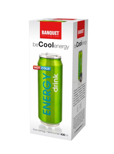 Termoska BE COOL Energy 430 ml. Tělo dvoustěnné nerezové: uvnitř 18/8, vně 18/0, víčko: nerez 201 / PP / PS pítko / silikonové těsnění, brčko plast PE. Praktická termoska na studené i teplé nápoje.