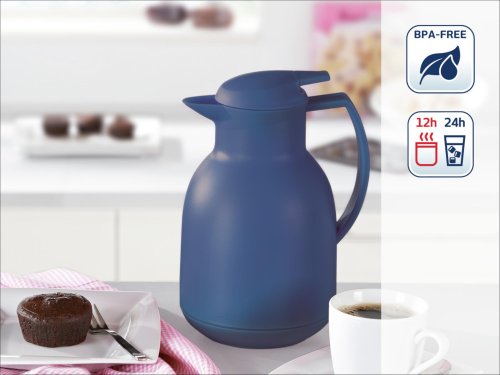 Termoska Leifheit - Bolero, tmavě modrá, 1 l Originální design, nově s tlačítkem pro uchování aroma Materiál plast Jednoduché ovládání tlačítkem aroma (otevíraní, nalévání a uzavření) Objem 1 l