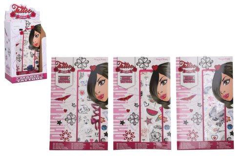 Tetovací samolepky holky. Více variant v display boxu. Rozměry archu: 15,3x0,1x25cm. Návod na aplikaci na obale: Sloupnout folii, přilepit papír s tetováním na pokožku, namočit a přitlačit houbičkou, sundat opatrně papír.