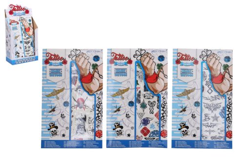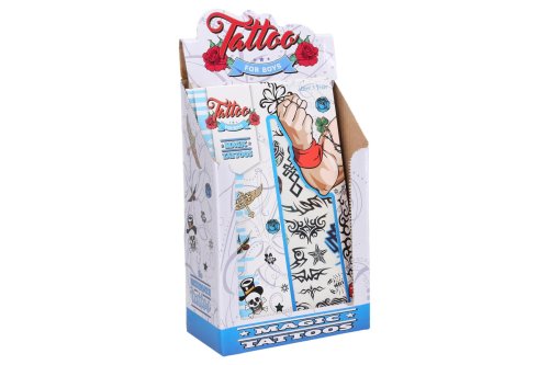 Tetovací samolepky kluci. Více variant v display boxu. Rozměry archu: 15,3x0,1x25cm. Návod na aplikaci na obale: Sloupnout folii, přilepit papír s tetováním na pokožku, namočit a přitlačit houbičkou, sundat opatrně papír.