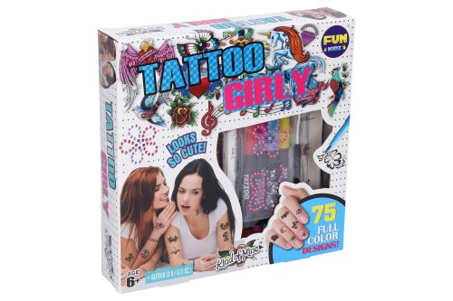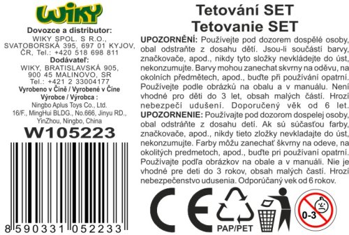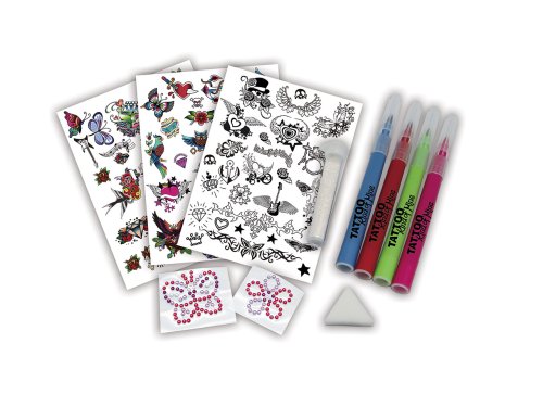Tetování s fixami set. Balení obsahuje 4 tetovací fixy, tetovačky, kamínky, houbičku, štěteček a flitry.