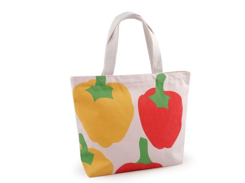 Kvalitní bavlněná taška je z pevného hrubého plátna, které imituje len. Na obou stranách ji zdobí veselý letní potisk s motivem plodů. Zapíná se na zip, má rozšířené dno, díky kterému je navzdory své menší velikosti poměrně prostorná. Má dvě ucha do ruky.