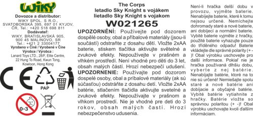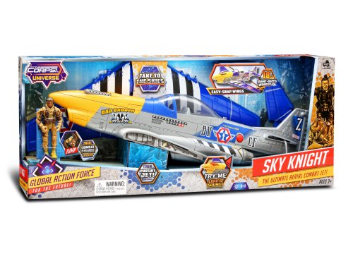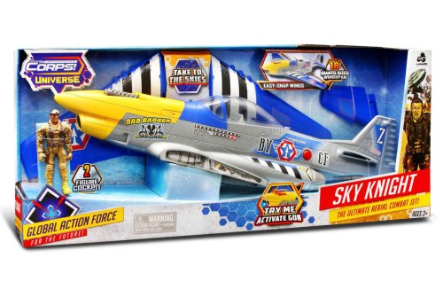 The Corps letadlo Sky Knight s vojákem. Délka letadla 51 cm, rozpětí křídel 46 cm, voják 10 cm. Kokpit pro 2 figurky. Světelné a zvukové efekty. 2xAA baterie součástí. Návod na složení a umístění samolepek na obalu.