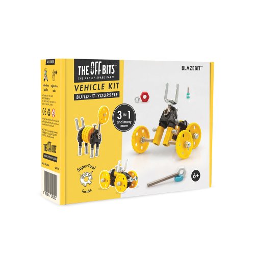 Zahřejte motor, je čas jít! BlazeBit je perfektní vozidlo s pohonem 4 kola pro vašeho robota Offbits. Díky sortimentu koleček a chytrých konektorů vybavíte svého robota na dobrodružství ve velkém stylu. Popusťte uzdu své fantazii. Tato sada umožňuje vytvoření tří modelů s dalšími nekonečnými možnostmi pro vaše vlastní kreativní nápady. Jedná se o hračku, která pomáhá mladým lidem růst v oblastech vědy, technologie, inženýrství, umění a matematiky. Hračky OffBits také podporují rozvoj jemné motoriky, prostorové představivosti, řešení problémů a nápadité hry. Co můžete postavit:BlazeBit, MotorBit, AnimalBit plus nekonečné množství jedinečných výtvorů, které můžete postavit pomocí své fantazie. Máte kolem sebe karton, šroubky nebo jiné zábavné materiály? Vylepšujte s předměty každodenní potřeby a vytvořte také své vlastní jedinečné vynálezy. Hlavní vlastnosti: obsahuje nářadí pro sestavení stavebnicekompatibilnost s každodenními předmětyrozvoj kreativity, jemné motoriky i logického myšlenívhodné od šesti let3 v 1 Ilustrační foto balení: