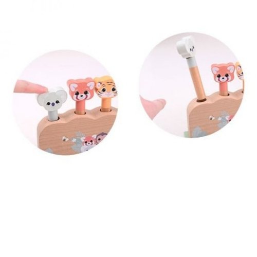 hlavičky zvířátek z kolekce The Wildies Family jsou umístěné na kolíkách zasunutých v dřevěném podstavci