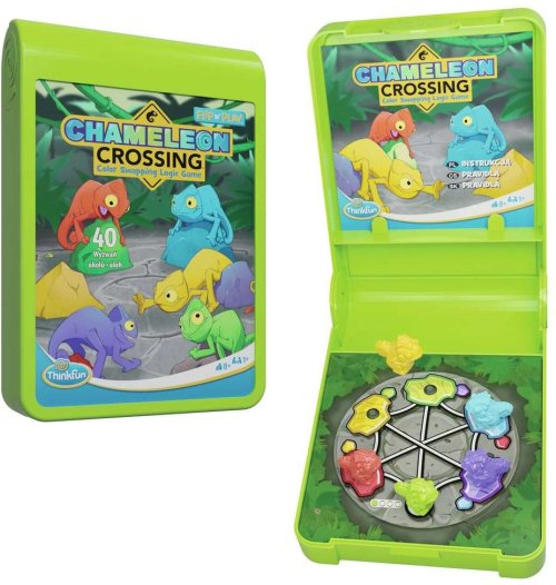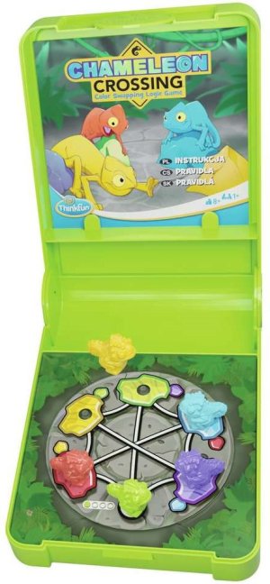 Pomozte pěti ztraceným chameleonům najít cestu zpátky na správný domovský kámen! Zábavná logická hra od ThinkFun. Obsahuje: 5 žetonů s chameleonem, 20 oboustranných karet s úkoly, pokyny a řešení, herní kufřík s vestavěnou hrací plochou