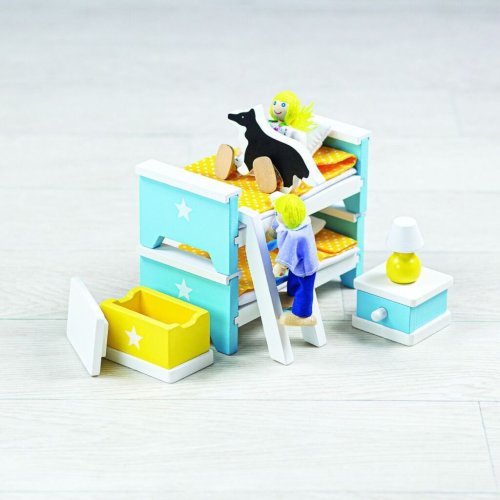 Krásný nábytek z bukového dřeva se bude hodit do každého domečku pro panenky, který má prostě vše, co budou děti potřebovat k vytvoření pokojíčku pro panenky, které jsou unavené po celém dni plném her. Set o osmi kusech zahrnuje dvě postele, které se mohou složit do poschoďovky, žebřík, noční stolek s lampičkou a malý domeček pro panenky, který připomíná domeček pro panenky Tidlingtion (T0220) a také truhlu s hračkami a jeden doplněk. Postele mají také své lůžkoviny, které panenku udrží přes noc v teple! Krásně detailní set se bude hodit do domečku pro panenky Tidlington a jiné domečky standardní velikosti. Podporuje kreativní a představivou hru. Vyrobeno z kvalitních materiálů z odpovědných zdrojů. Odpovídá evropské bezpečnostní normě. Skládá se z 8 dílů. Hlavní vlastnosti: 8 ks včetně lůžkovinpodporuje kreativitu a představivost