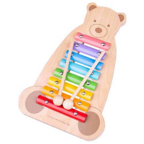Medvěd jako xylofon, to je brilatní nápad! Tento dřevěný hudební nástroj má 8 barevných kovových destiček a 2 dřevěné paličky, hodí se k brzkému uvedení do světa hudby. Děti najdou v medvědovi kamaráda a hudbu si tak jistě zamilují. Barevné destičky si děti mohou jednoduše spojit s tóninami, zapamatovat si je a přehrávat si tak vlastně vytvořené skladby. Xylofon má velikost tak akorát pro dětské ruce. Skvělý způsob, jak rozvinout u dětí smysl pro rytmus, poznávání barev a senzoriku. Rozvíjí také koordinaci ruka-oko, jemnou motoriku a zručnost. Vyrobeno z kvalitních materiálů z odpovědných zdrojů. Odpovídá evropské bezpečnostní normě. Hlavní vlastnosti: 8 barevných kovových destiček2 dřevěné paličkyrozvíjí koordinaci ruka-oko, jemnou motoriku a zručnost