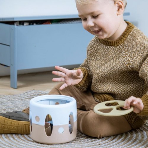 Plastová vkládačka v krásných, jemných barvách, která stimuluje jemnou dětskou motoriku a podporuje rozvoj koordinace oko-ruka.