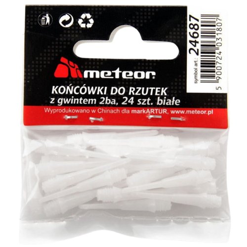 Náhradní plastové hroty Meteor Tips v balení po 24 kusech jsou určené pro šipky k elektronickým terčům. Nepostradatelný doplněk v menším balení pro každého hráče šipek. Hroty mají průměr 4 mm a délku 3 cm. Náhradní plastové hroty Meteor nabízíme v černé nebo bílé barvě.