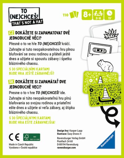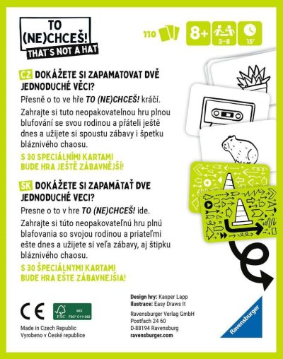 Dokážete si zapamatovat dvě jednoduché věci? Přesně o to ve hře TO (NE)CHCEŠ! kráčí. Zahrajte si tuto neopakovatelnou hru plnou blufování se svou rodinou a přáteli ještě dnes a užijete si spoustu zábavy i špetku bláznivého chaosu. Jednoduché. Nezapomenutelné. Zábavné. Úžasné! Hráči si navzájem dávají dárky a přitom se snaží zapamatovat, kdo komu dal jaký dárek a jaký dárek mají před sebou. Pokud si to nedokážou zapamatovat, musí blufovat, aby nedostali trestný bod. Kdo bude mít na konci nejnižší skóre, vyhraje! S 30 speciálními kartami bude hra ještě zábavnější! Obsahuje: 110 herních karet, pravidla hry