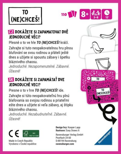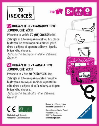 Dokážete si zapamatovat dvě jednoduché věci? Přesně o to ve hře TO (NE)CHCEŠ! Kráčí. Zahrajte si tuto neopakovatelnou hru plnou blufování se svou rodinou a přáteli ještě dnes a užijete si spoustu zábavy i špetku bláznivého chaosu. Jednoduché. Nezapomenutelné. Zábavné. Úžasné!