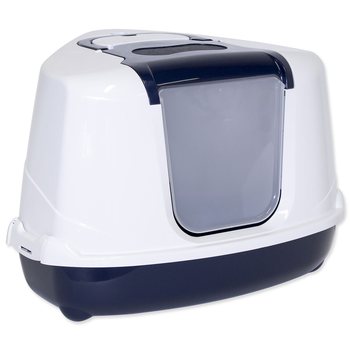 Rohová toaleta pro kočky s plastovým krytem, dvířky, filtrem a lopatkou.