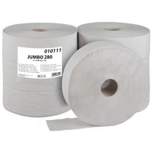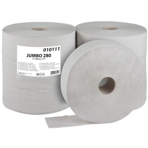 Toaletní papír jumbo 1vrstvý Barva šedá Materiál: recykl Průměr dutinky 6 cm Průměr role 26 cm Návin 265 m V balení 6 rolí