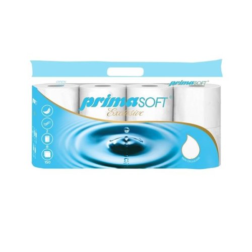 Toaletní papír PrimaSOFT- 2vrstvý, extra bílý 100% celulóza Návin 17,55 m Rozměr útržku 9x11,7 cm Průměr dutinky 4,7 cm Průměr role 9 cm Výška role 11,5 cm Počet útržků 150 Počet rolí 8