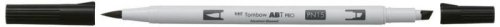Oboustranný fix na alkoholové bázi se štíhlým tělem a dvěma hroty: širokým seříznutým hrotem pro široké tahy a tenkým štětcovým hrotem s variabilní šířkou stopy. Štětcový hrot je vyroben z nylonu, a je proto mimořádně pružný a dynamický. Přestane-li být na hrot vyvíjen tlak, vrátí se do svého původního tvaru. Díky tomu jej lze snadno ovládat. Štíhlé tělo fixu se pohodlně drží v ruce. Tok barevného inkoustu je pomalý, při styku s papírem ho vytéká menší množství, což umožňuje kontrolované a mimořádně přesné malování. Opakované nanášení inkoustu na alkoholové bázi zajišťuje velmi dobré krytí bez viditelných tahů. Vrstvením inkoustu lze vytvořit efekty, barevnou hloubku, stíny a výraznější barvy. Fixy ABT PRO jsou perfektní pro ilustrování, kreslení mangy a komiksů, vytváření návrhů a náčrtů v módním návrhářství, při vyvíjení nových produktů, v oblasti architektury a mnoha dalších. Dostupný ve 107 barvách a jako blender. Upozornění: Fixy ABT PRO skladujte v horizontální poloze a pečlivě je uzavírejte.