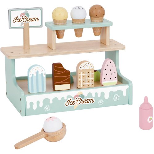 Nepřehlédnutelný dřevěný zmrzlinový stánek pro děti je skvělou hračkou při hře na profese Samotný stánek má rozměr 30 x 23 x 18 cm a stane se tak krásným doplňkem dětského pokojíčku Kromě dřevěnéhostánku uvnitř balení děti najdou dalších 18 dřevěných kousků na variabilní skládání kopečkových zmrzlin a nanuků Nechybí ani naběračka na zmrzlinu, se kterou děti krásně naberou kopeček a díky pevnému magnetku jej nandají na kornoutek Na stánku je také malá černá tabulka, kam děti napíšou či nakreslí aktuální menu či ceník