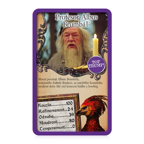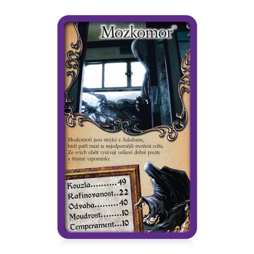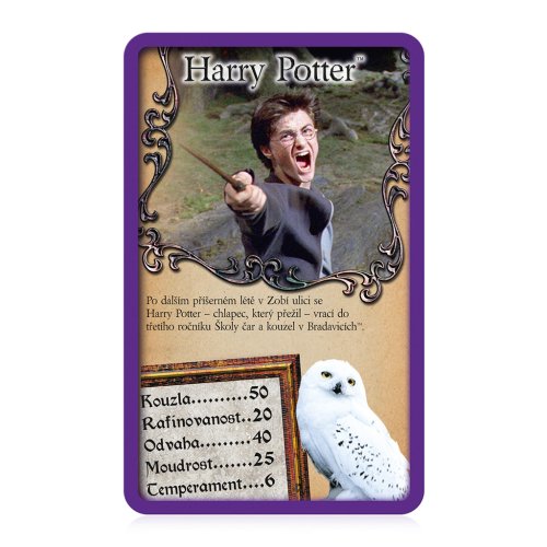 Oficiálně licencovaná karetní hra, kterou si užijí kouzelníci i mudlové. Světový bestseller konečně v českém jazyce! Díky této hře si oživíte fantastické příběhy z jednotlivých dílů s oblíbenými postavami. V každém díle na Vás čekají jiné postavy a jejich charakterové kombinace. Zjistěte, jak odvážný je Ron Weasley, jak mazaný je Rubeus Hagrid a jaké úrovni magie, vládne profesor Snape. Připravte si kombinaci postav k přelstění vašich protivníků, objevte nová a vzrušující fakta ve světě Harryho Pottera. V plastovém pouzdře ideálním na cesty. Hráči: 2+, věk: 6+