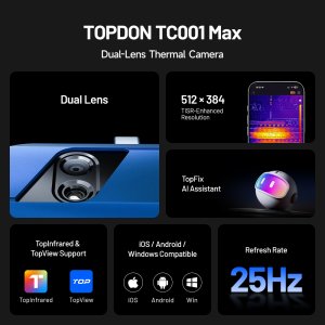 Technické specifikace: Značka: TOPDON Model: TC001 Max Rozlišení: 256 x 192 Thermal Image Super Resolution (TISR): Podporováno; až 512 x 384 px AI asistent: Ano - TopFix Dosah detekce: 0,1 až 320m Frekvence snímků: 25Hz Tepelná citlivost: <40mK Rozměry: 7 x 3,5 x 1,5 cm Hmotnost: 33g Rozsah tepelného měření: -20°C~550°C Přesnost měření: ±2°C nebo ±2% Kompabilita: iOS/Android/Windows Výstup: USB-C